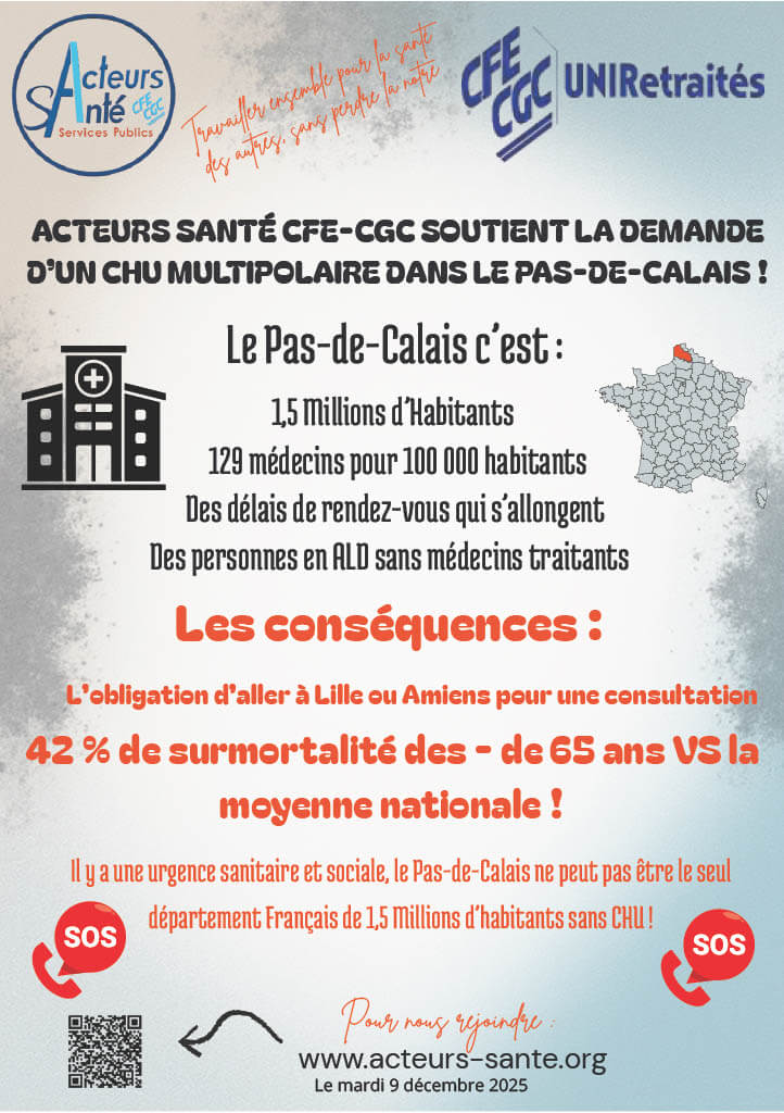 Face à cette réalité, Acteurs Santé CFE-CGC apporte son soutien entier et déterminé à la demande de création d’un CHU multipolaire, portée collectivement par plusieurs organisations.